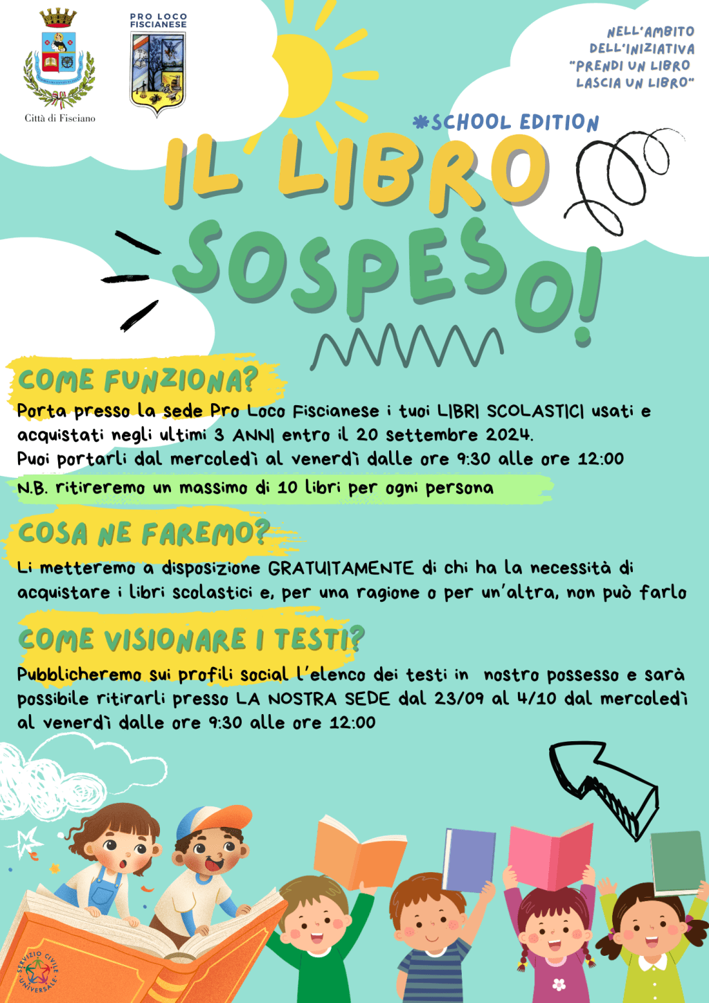 Questo progetto prevede la raccolta di libri scolastici usati, acquistati negli ultimi 3 anni, che potrete consegnare presso la sede della Pro Loco Fiscianese durante questa e la prossima settimana.