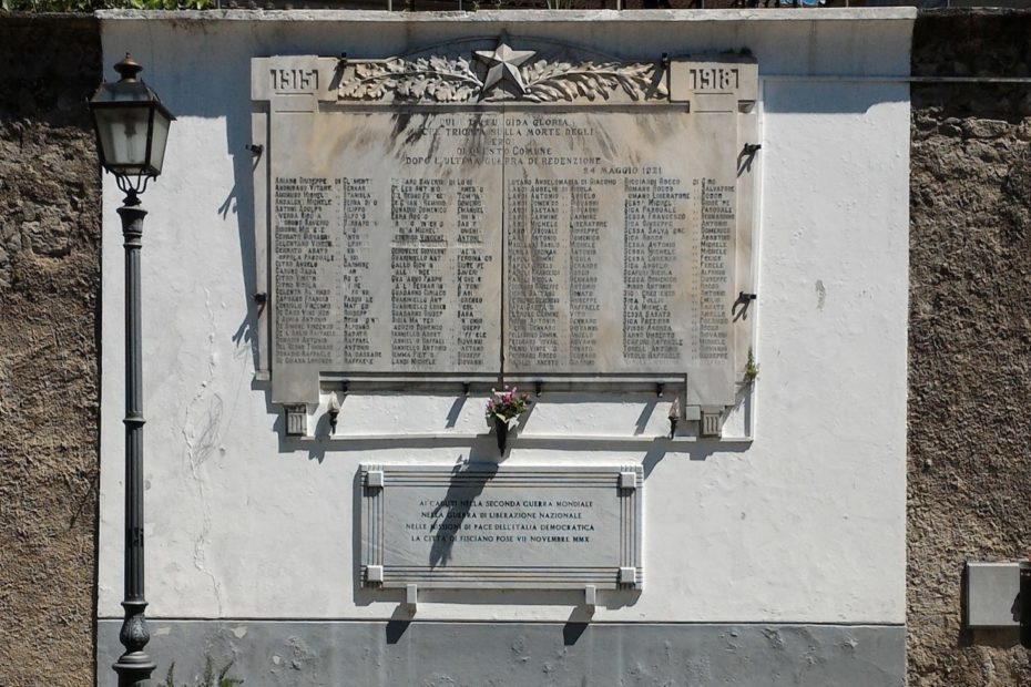 Le lapidi delle vittime delle due Guerre mondiali, sono situate in piazza Vittorio Emanuele, al lato dell’obelisco a San Rocco. La prima è in marmo bianco, in alto vi è un rilievo raffigurante una stella tra un ramo di alloro ed uno di quercia tra le date 1915-1918, segue l’epigrafe: “QUI È LA FULGIDA GLORIA CHE TRIONFA SULLA MORTE DEGLI EROI DI QUESTO COMUNE DOPO L’ULTIMA GUERRA DI REDENZIONE 24 MAGGIO 1921”; al centro, l’elenco dei 109 caduti della Prima Guerra Mondiale, in basso due lampade votive. La seconda, in basso di dimensioni minori in marmo bianco, commemora i caduti della Seconda Guerra Mondiale (1939-1945), con epigrafe: “AI CADUTI DELLA SECONDA GUERRA MONDIALE NELLA GUERRA DI LIBERAZIONE NAZIONALE NELLE MISSIONI DI PACE DELL’ITALIA DEMOCRATICA LA CITTÀ DI FISCIANO POSE VII NOVEMBRE MMX”.
